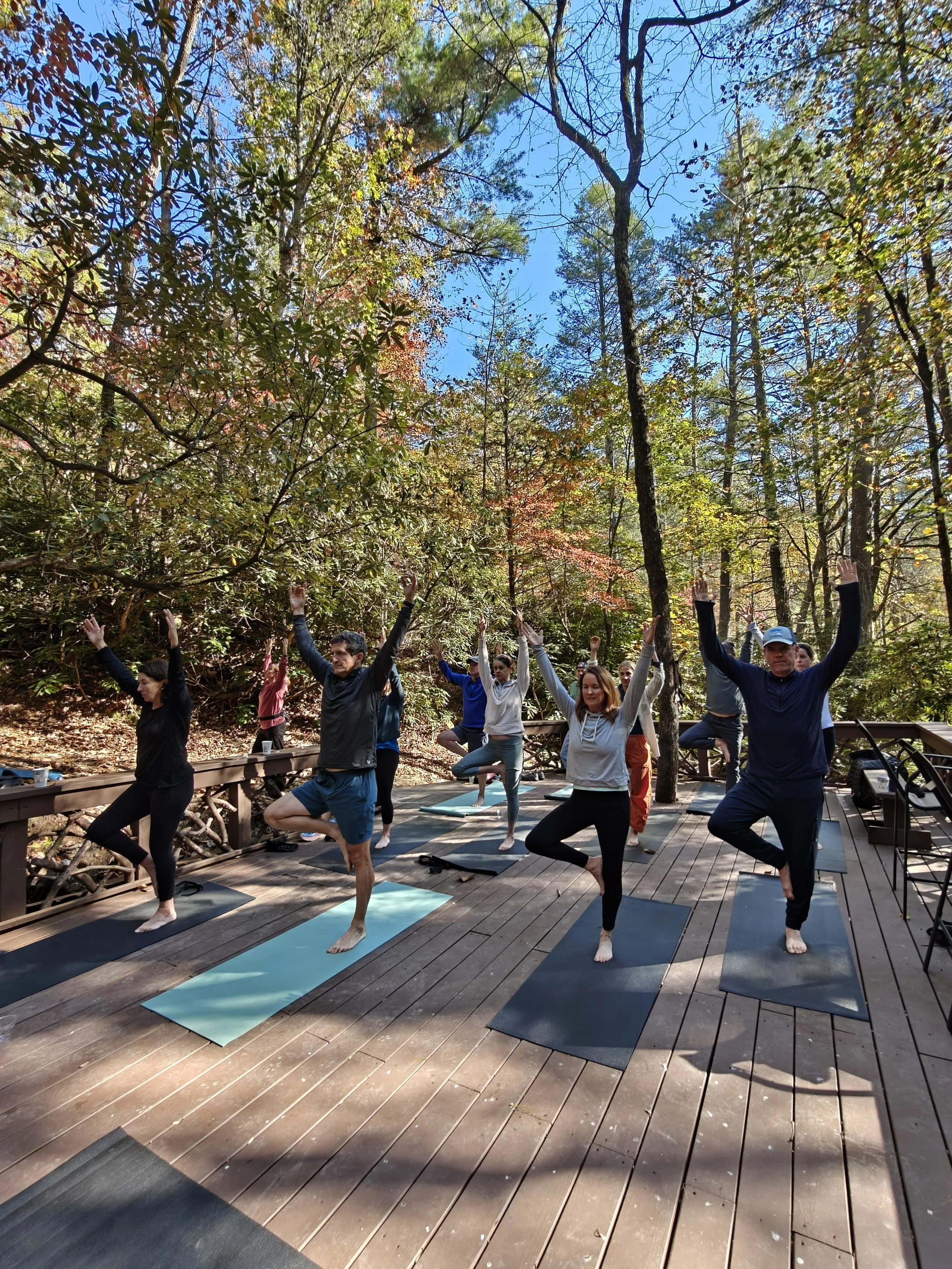 What the above picture doesn’t show is the rushing water right alongside this deck, revealing yet another beautiful waterfall, Sliding Falls, and a bridge uniquely crafted together with fine wood pieces. The setting is absolutely stunning, the perfect space & surrounding nature to keep you grounded and at peace. So no matter your experience with yoga or meditation, our immersive experience accommodates all to get in-touch with a deeper sense of being.